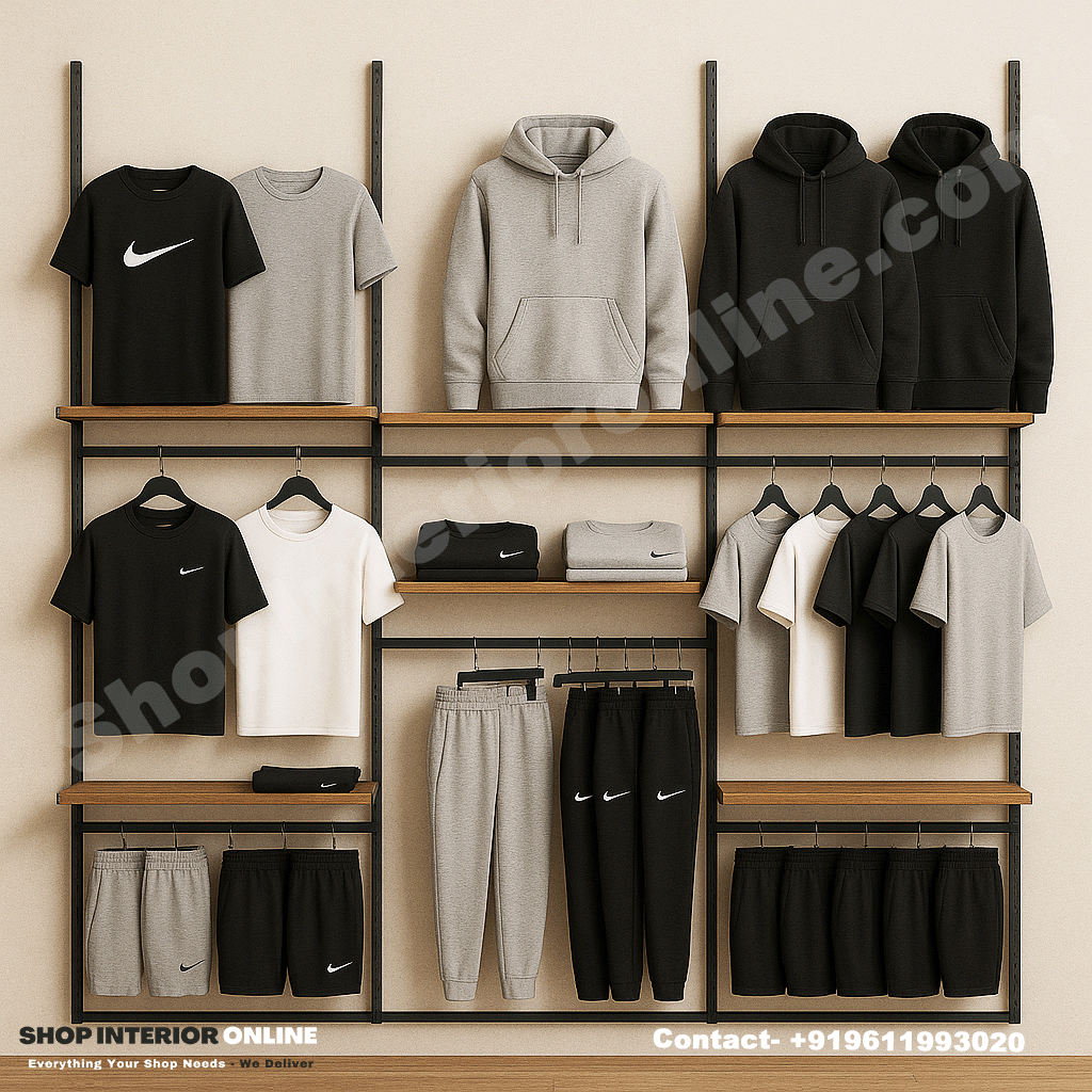 Each section offers a balanced combination of folded, hanging, and storage displays — helping you make the most of every inch of your wall while maintaining a clean, professional aesthetic.