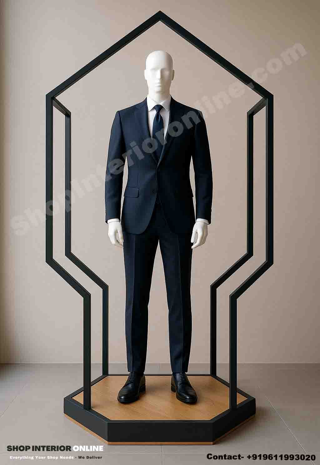 The Black Hexa-Edge Display Stand blends geometry with functionality, creating a perfect stage for showcasing formalwear, ethnic outfits, or high-end apparel.