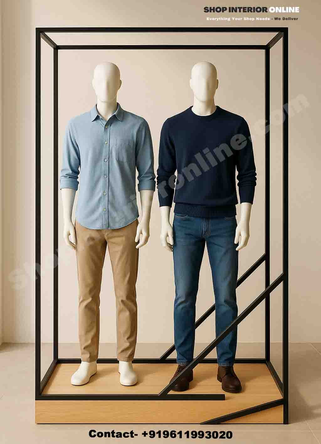 The Dual Mannequin Display Frame System offers a luxury-grade structure for displaying two mannequins side by side. Itās crafted to deliver a bold window-front presence for premium apparel brands.