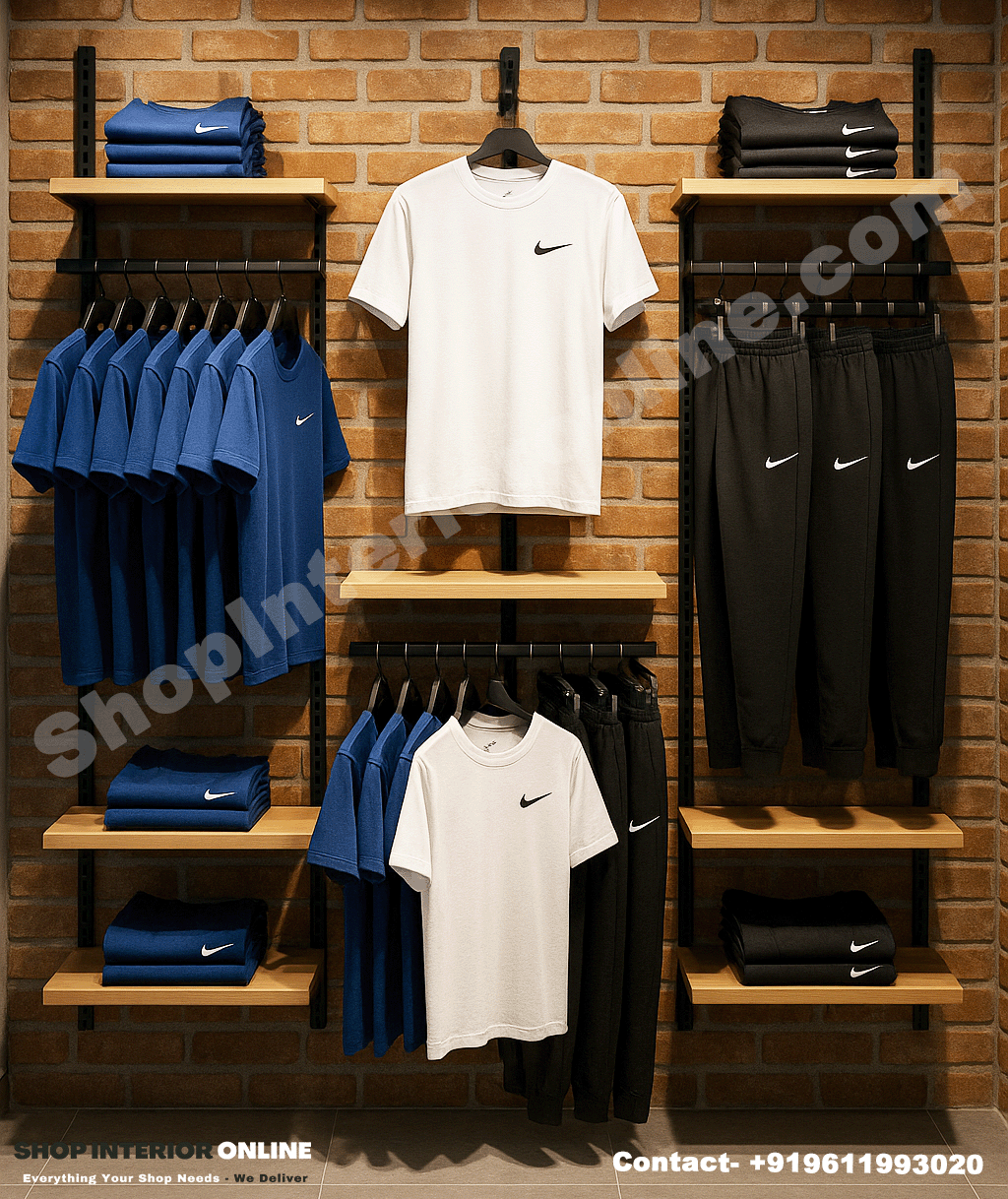 Designed for T-shirts, joggers, and folded clothing, this setup provides maximum visibility and organization, ensuring every product looks premium under soft lighting.