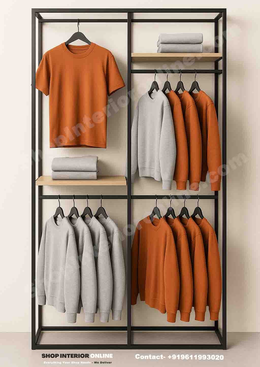 With two distinct sections, it helps organize tops, hoodies, and folded stock efficiently — making your apparel visually appealing and easy to browse.