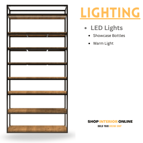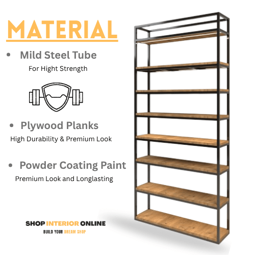 Rack is made up of Mild steel tube with powder coating and above it Plywood planks with below light is placed and all sizes of comparment is designed according to wine bottles different sizes. with costlier big bottles on top racks and in middle high sell bottles and in down compartment is stocking place.