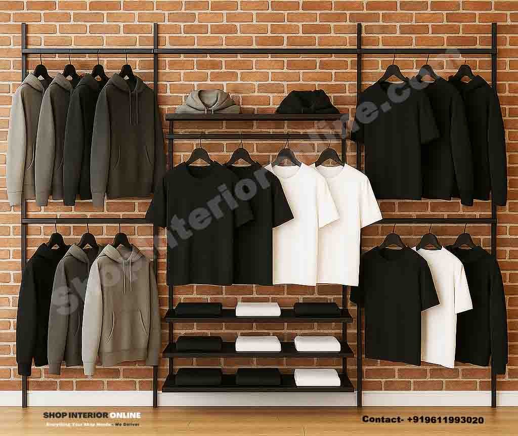 The Triple-Section Wall Mounted Garment Rack combines strength and style — made from matte black steel channels and warm wooden shelves. Designed for sportswear, hoodies, and minimal fashion stores, this system gives your display an upscale retail appeal while maintaining functionality and balance.